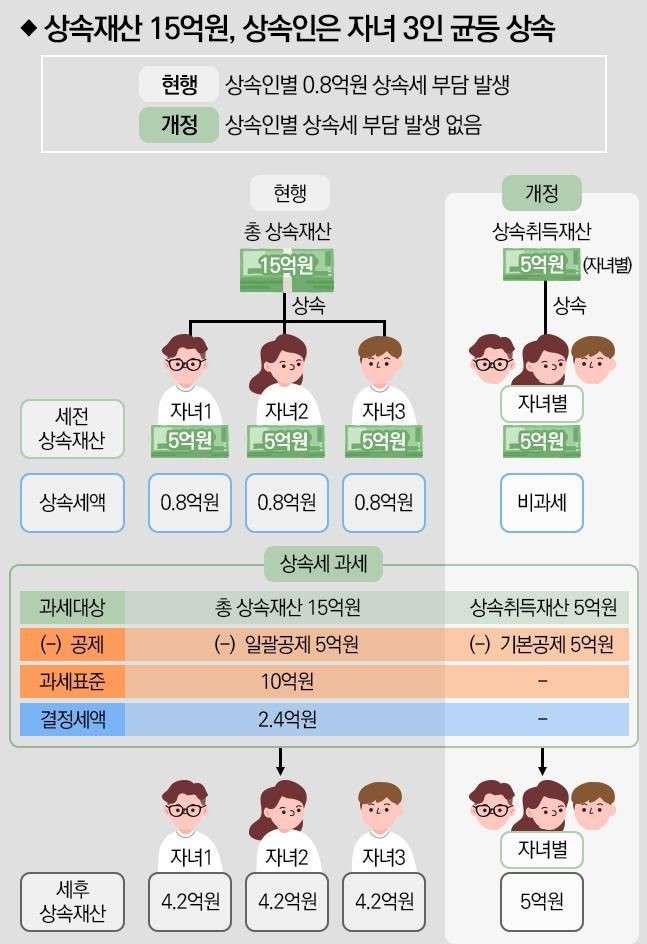 정부가 추진하는 유산취득세 개편안은 대부분 상속가구에서 기존보다 세 부담이 줄어드는 효과를 가져올 것으로 전망됩니다. 상속재산이 각 상속인별로 분할되어 과세되기 때문에 누진세 부담이 완화되고, 자녀 공제의 대폭 확대 역시 세 부담을 줄이는 요인으로 작용합니다. 예를 들어, 상속분 15억원을 세 자녀가 동일하게 분할하여 받는 경우, 자녀별로 인적 공제 5억원이 적용되어 실제 과세 대상이 0원이 될 수 있습니다.